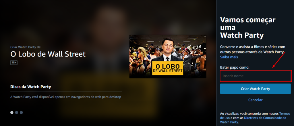 Nesta etapa insira o nome que ficará visível para todos e toque sobre ‘CRIAR WATCH PARTY‘.