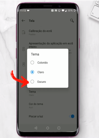Acesse às configurações de seu smartphone e mude para o tema escuro manualmente, para isso vá em CONFIGURAÇÕES > TELA > TEMA > ESCURO.