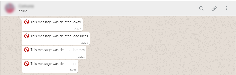 Após ter sincronizado a versão web com seu smartphone basta passar o cursor do mouse sobre a mensagem que foi apagada para visualizar o conteúdo que foi deletado pelo outro usuário.
