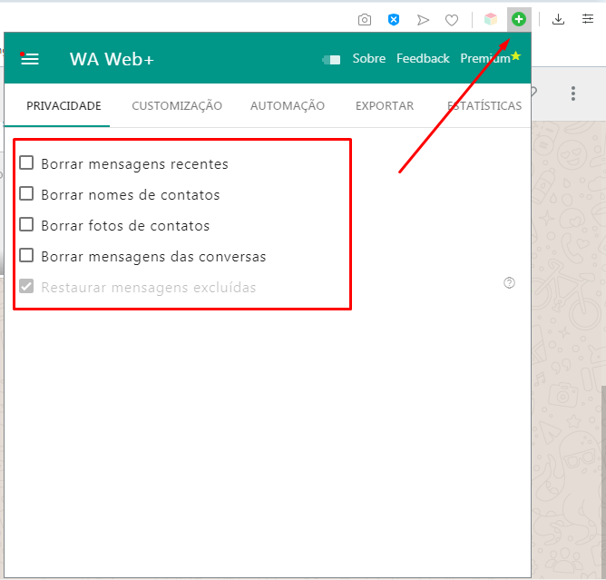Como dito anteriormente, também é possível ter acesso a recursos extras na versão web do mensageiro, para habilitar algumas basta tocar sobre o ícone da extensão no canto superior direito e em seguida marcar as opções que deseja utilizar.