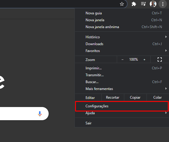 Acesse a barra lateral do Chrome e siga até a opção de ‘CONFIGURAÇÕES‘, conforme mostra a imagem abaixo: