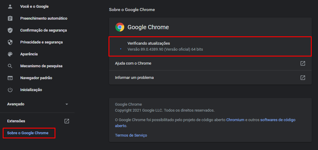 No menu lateral toque sobre a opção ‘SOBRE O CHROME’ e verifique qual é a versão atual do navegador. Caso seja inferior a 89.0.4389.90 procure por novos updates e execute a atualização, em seguida reinicie o computador para que as novas definições sejam aplicadas.