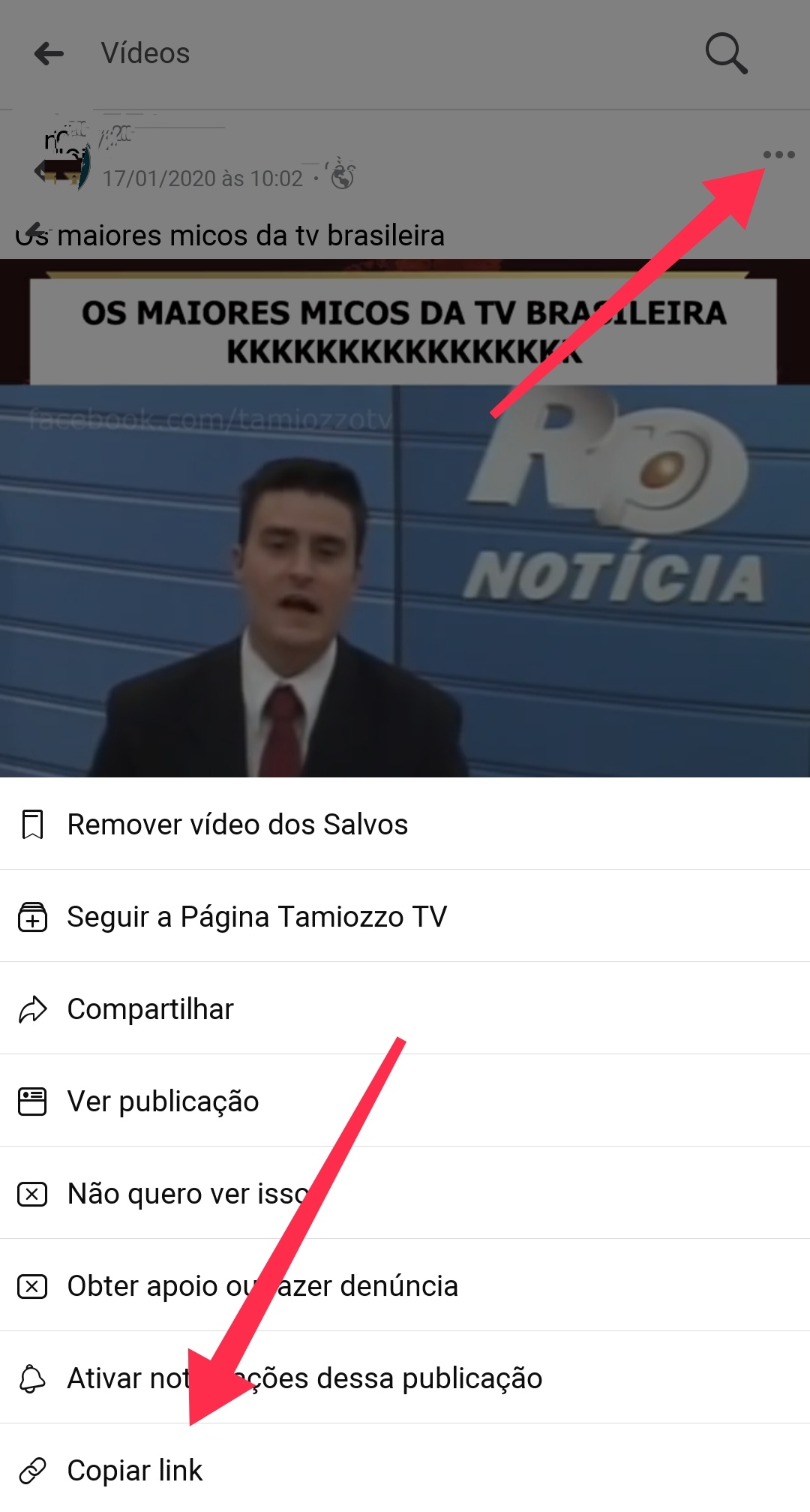 Para que seja possível baixar o vídeo em questão você deverá copiar o link de compartilhamento, para isso vá em: abra seu Facebook > Localize o vídeo > Toque sobre os três pontos na parte superior direita > copiar link. Veja: