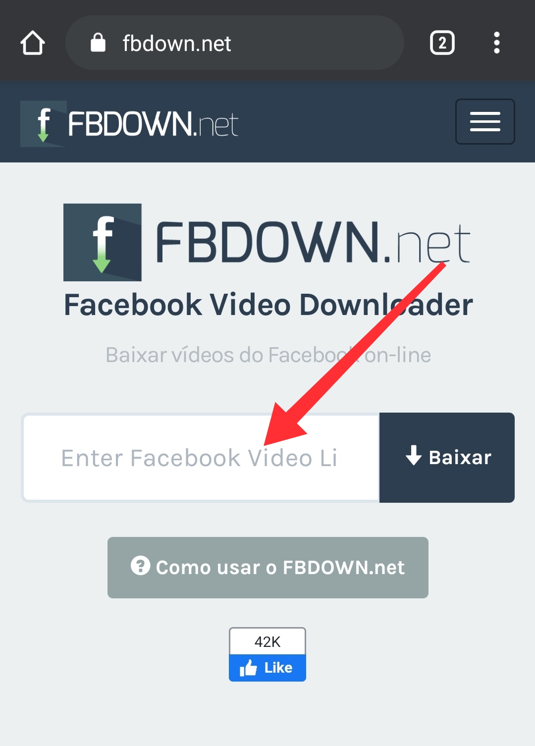 Após ter copiado o link do vídeo a ser baixado abra seu navegador – preferencialmente o Google Chrome – e em seguida cole o seguinte endereço na guia de busca: fbdown.net.