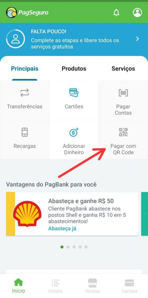 A função de pagar escaneando o código está disponível no menu principal do PagBank, para acessar toque sobre ‘PAGAR COM QR Code’ e em seguida faça a leitura utilizando a câmera do seu smartphone.