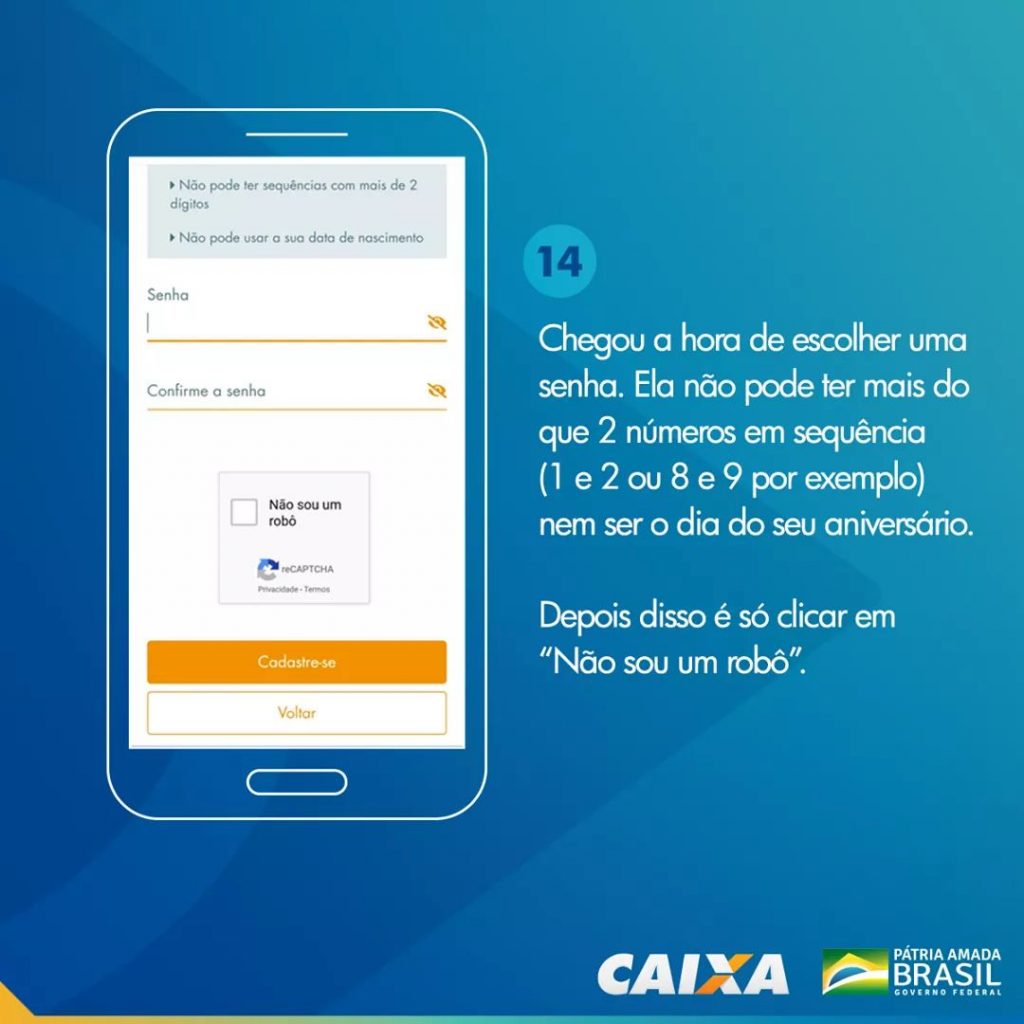 Em seguida defina uma senha, ela será utilizada para acessar o Caixa Tem. A senha NÃO deverá ter: