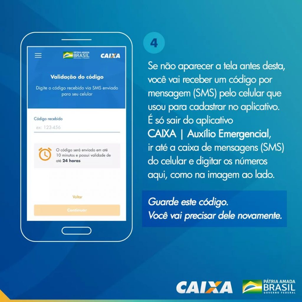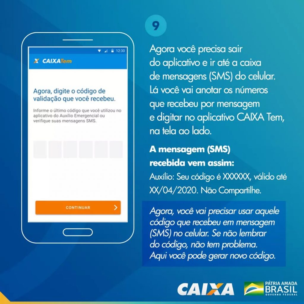 Tendo feito o passo anterior você receberá um código de verificação via SMS, copie e digite no Caixa Tem.