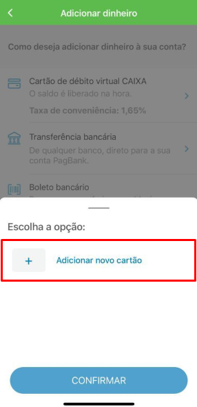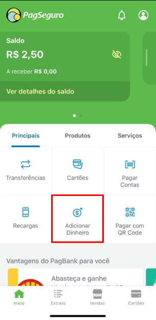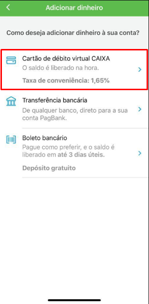 Abra o aplicativo do PagBank e na tela inicial toque sobre ‘ADICIONAR DINHEIRO‘ e em seguida ‘CARTÃO DE DÉBITO VIRTUAL CAIXA‘.