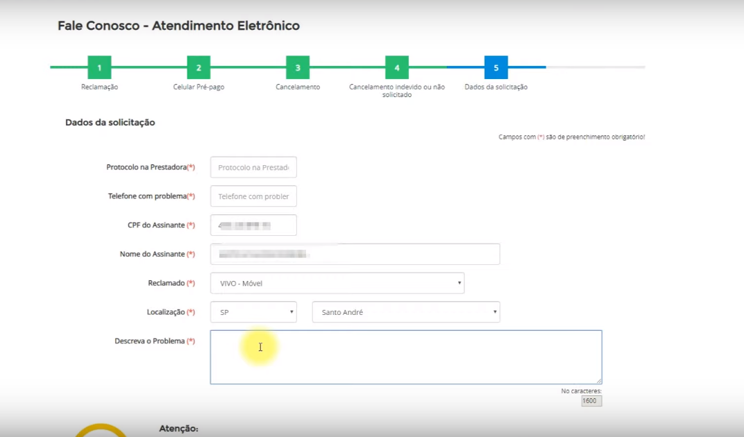 Na última etapa você deverá inserir seus dados e adicionar uma breve descrição do problema, seja sucinto e direto. É importante adicionar o protocolo de atendimento informado pela operadora anteriormente. O tempo de resposta leva em torno de 5 dias.