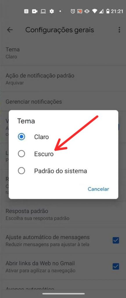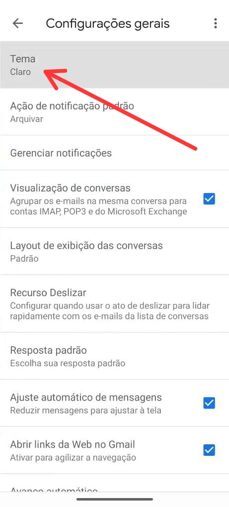 Ao acessar às configurações do Gmail você verá a opção ‘tema’ (primeira opção). Toque sobre e altere para o modo escuro. Veja:
