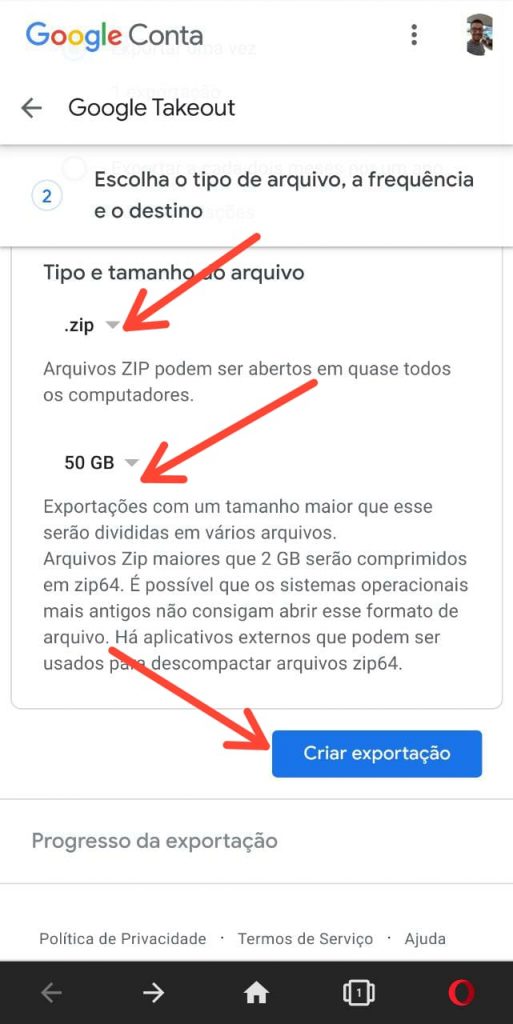Recomendamos também que você defina a extensão do arquivo como ‘.ZIP‘ e coloque o tamanho em ‘50GB‘. Em seguida toque sobre ‘CRIAR EXPORTAÇÃO‘. Vale ressaltar que o processo pode levar horas ou dias, tudo de acordo com a quantidade e o tamanho dos arquivos a serem exportados!