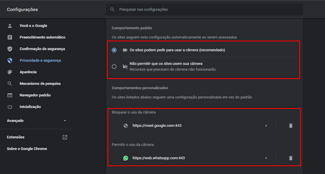Pronto, agora basta definir quais domínios podem acessar sua câmera ou microfone. Caso queira adicionar uma exceção basta adicionar em ‘PERMITIR O USO DA CÂMERA’.