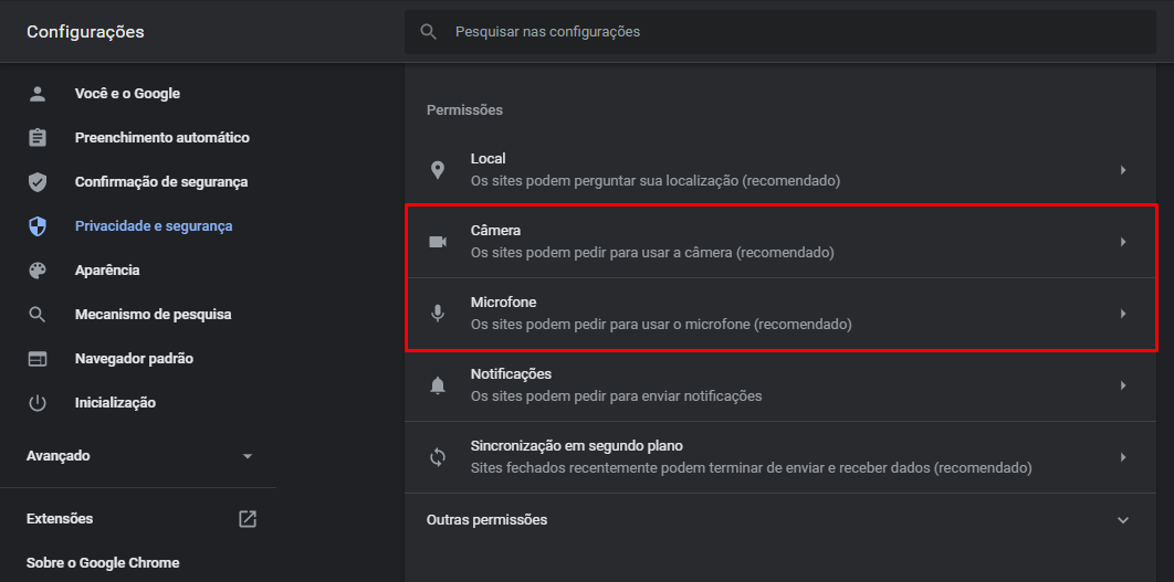 Nessa área você poderá configurar algumas permissões, incluindo a câmera e microfone, definindo se os sites podem solicitar acesso ou se será bloqueado por padrão. Toque sobre qual deseja alterar.