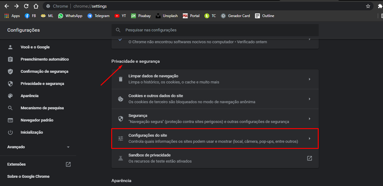 Acesse o menu lateral a siga até a página de configurações do Chrome, em seguida desça a página até as opções de ‘PRIVACIDADE E SEGURANÇA‘ e siga até ‘CONFIGURAÇÕES DO SITE‘.