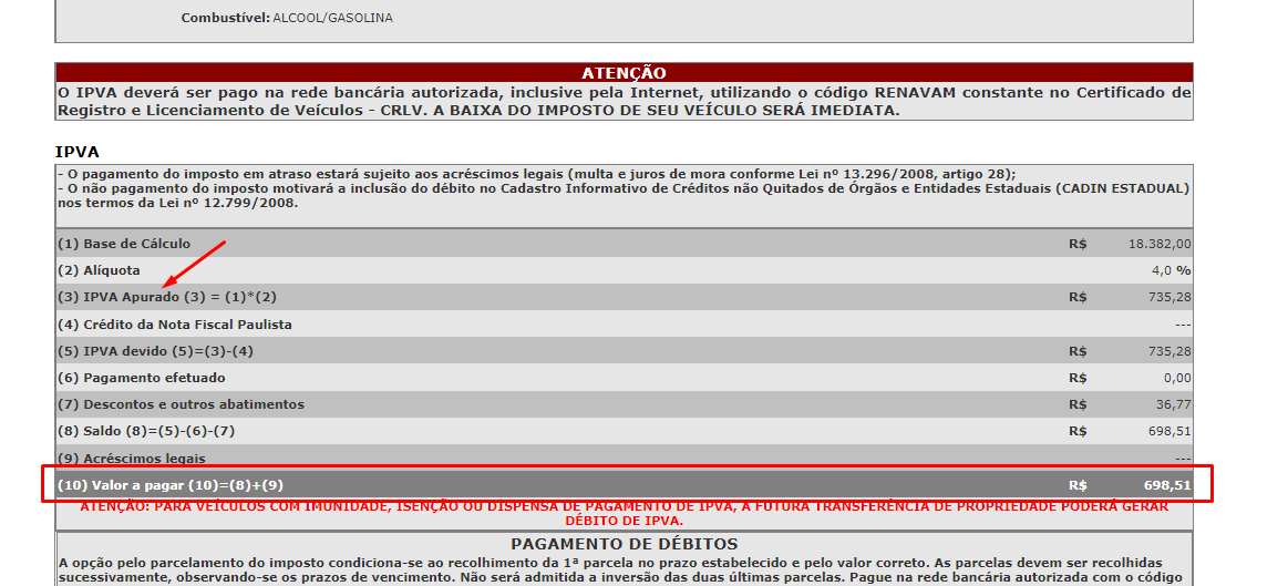 Para verificar o valor do IPVA desça a página e procure por ‘Valor a pagar’, o total descrito é o que deverá ser pago conforme a base de cálculo realizada pela tabela FIPE. Veja: