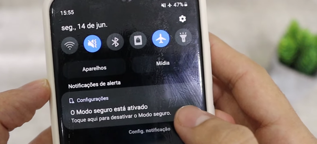 Na barra de notificações do seu telefone você verá uma notificação sobre o modo de segurança, para desativar toque sobre e em seguida pressione em ‘DESATIVAR‘.