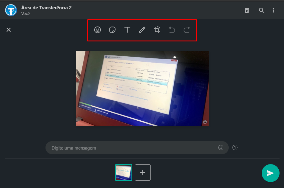 No menu superior você verá as opções de edição da imagem, sendo possível adicionar emojis, figurinhas, texto ou escrita personalizada. Além disso, também há ferramentas de retroceder ou avançar.
