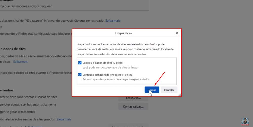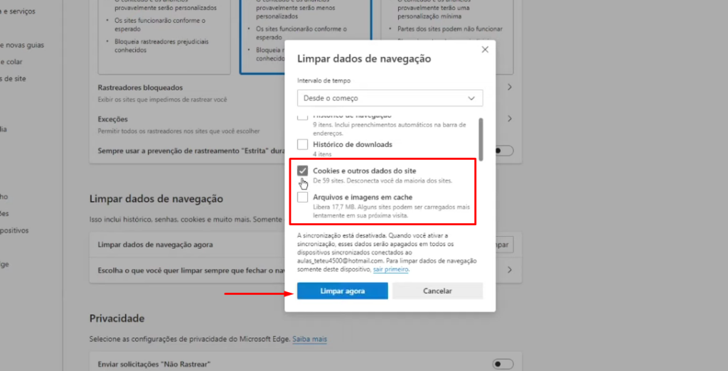 • Marque para apagar Cookies e Cache e confirme.