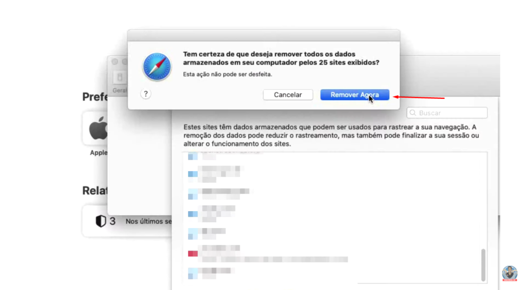 3. Aperte em “REMOVER TUDO” e confirme a exclusão. Reinicie o Safari.