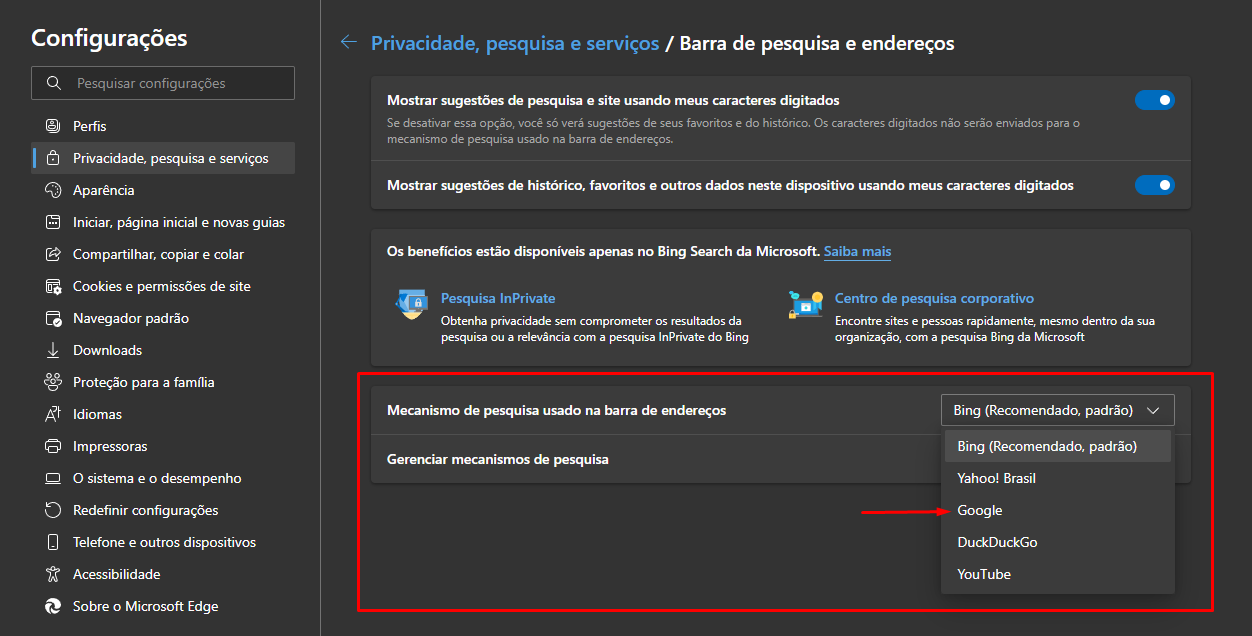 Através das configurações do browser é possível mudar essa definição nativa do programa, recurso interessante para quem prefere usar o Microsoft Edge, mas não está tão familiarizado com o mecanismo de busca do navegador.