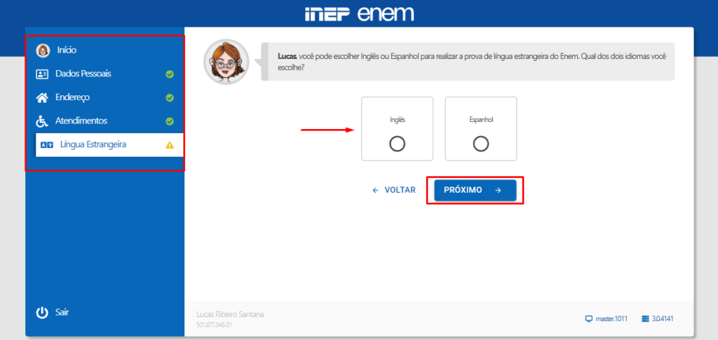 Agora, informe se deseja o inglês ou espanhol como língua estrangeira. Caso queira corrigir alguma informação, utilize o menu lateral esquerdo. Veja:
