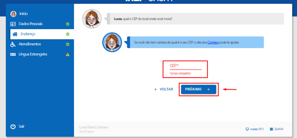 Em seguida, informe seu número de CPF e data de nascimento para iniciar a inscrição. Logo após confirmar esses dados, clique em “INICIAR A INSCRIÇÃO” e “PRÓXIMO“.