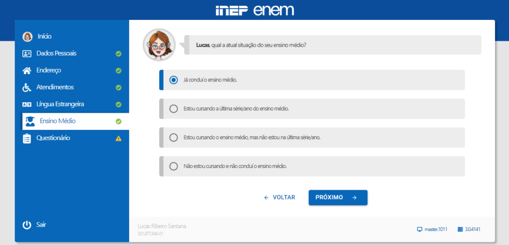 Nesta etapa, responda algumas perguntas sobre o seu período de conclusão do ensino médio. Essas informações podem ser solicitadas posteriormente, por isso não minta para conseguir cotas!
