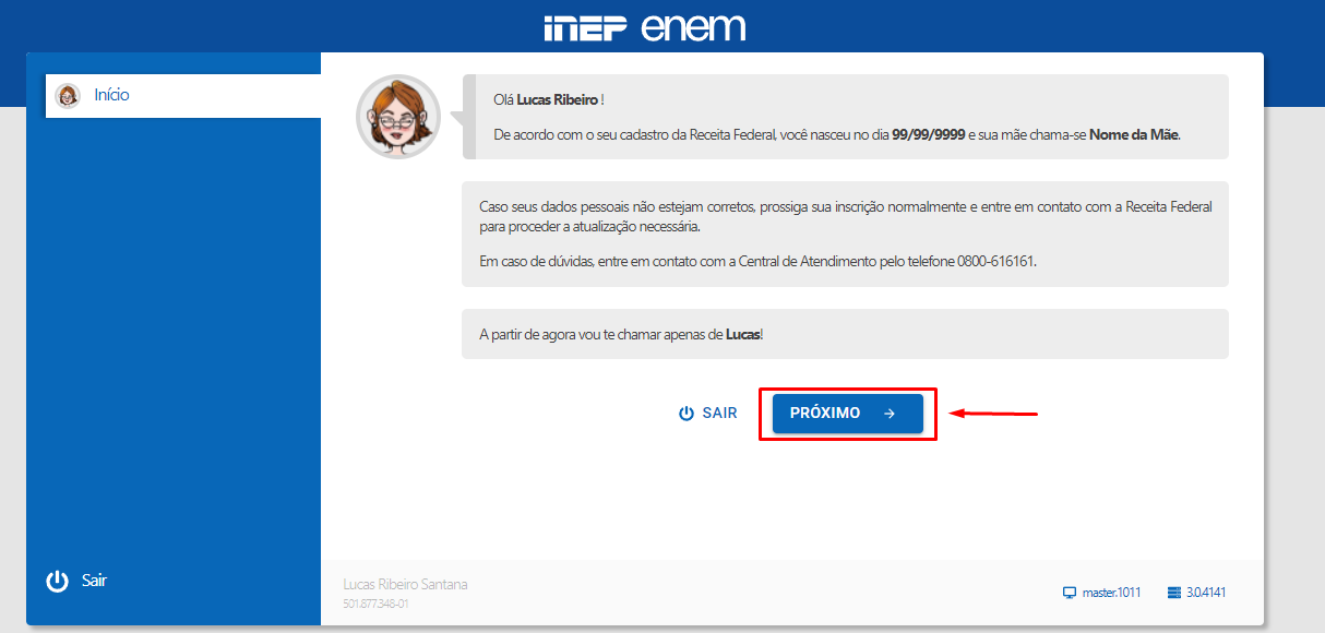 Em seguida, informe seu número de CPF e data de nascimento para iniciar a inscrição. Logo após confirmar esses dados, clique em “INICIAR A INSCRIÇÃO” e “PRÓXIMO“.
