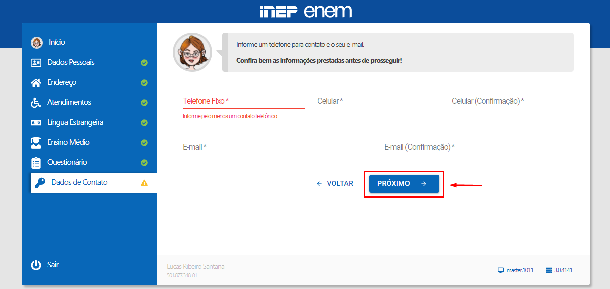 Neste passo, responda o questionário socioeconômico com 25 perguntas e, posteriormente, insira seus dados de contato (número de telefone e endereço de e-mail).