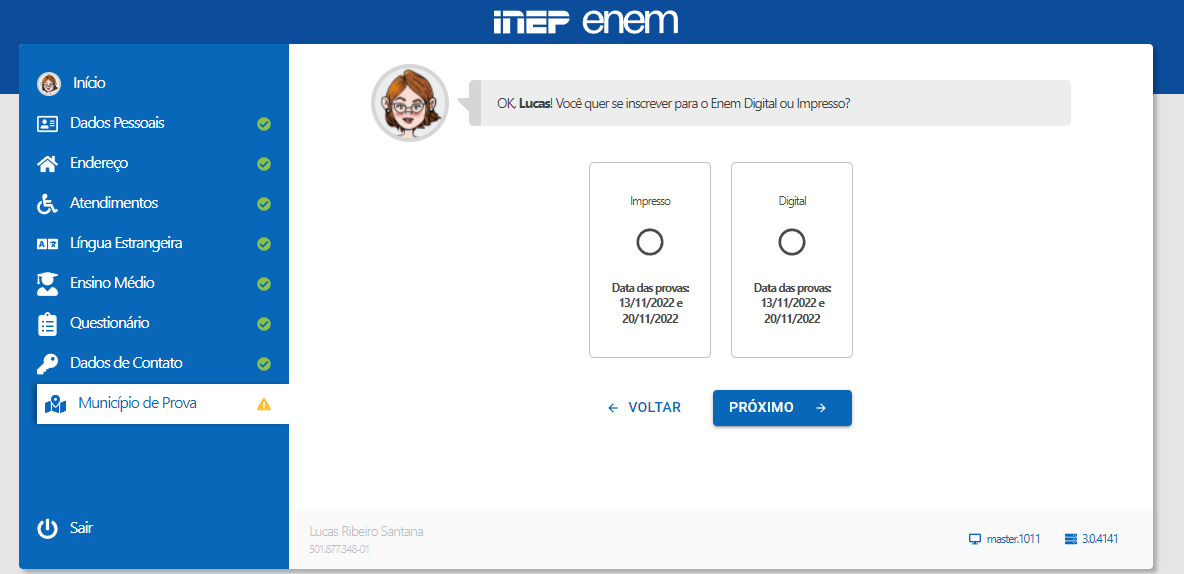 Nesta etapa, escolha se deseja realizar a prova IMPRESSA ou DIGITAL. Vale ressaltar que após escolher NÃO É POSSÍVEL ALTERAR.