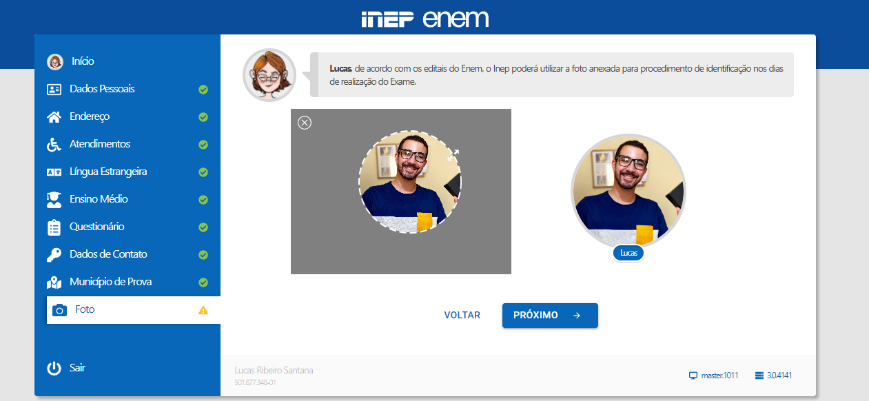 Agora, envie uma imagem sua de rosto que poderá ser usada pelos fiscais de prova para comparação com a fotografia do seu documento de identidade. Para evitar transtornos, não coloque fotos de animais, memes ou qualquer item que não seja seu rosto.