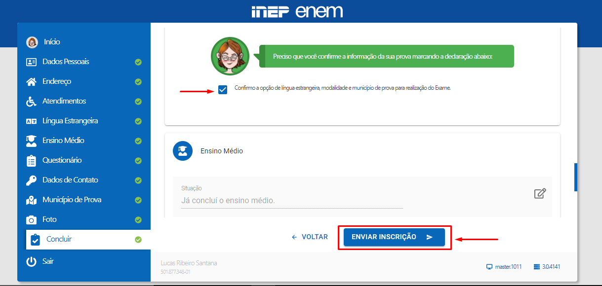 Por último, confirma todas as informações (nome completo, filiação, documentos de identidade, etc.) e marque “CONFIRMO A OPÇÃO DE LÍNGUA ESTRANGEIRA […]” e clique em “ENVIAR INSCRIÇÃO“.
