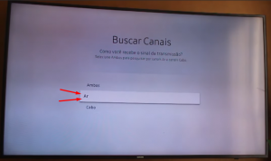 Passo 3: Na hora de escolher a opção de busca de canais, escolha a opção para buscar “Ar“, pois assim começará a busca por canais digitais: