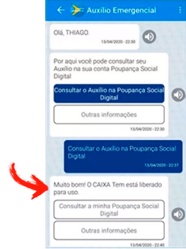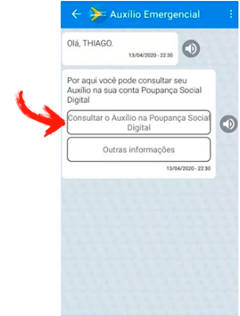 Primeiramente você deverá verificar se o seu aplicativo Caixa Tem já está pronto para uso. Para isso toque sobre a opção “Consultar Auxílio na Poupança Social Digital” e em seguida verifique a resposta informada pelo sistema.