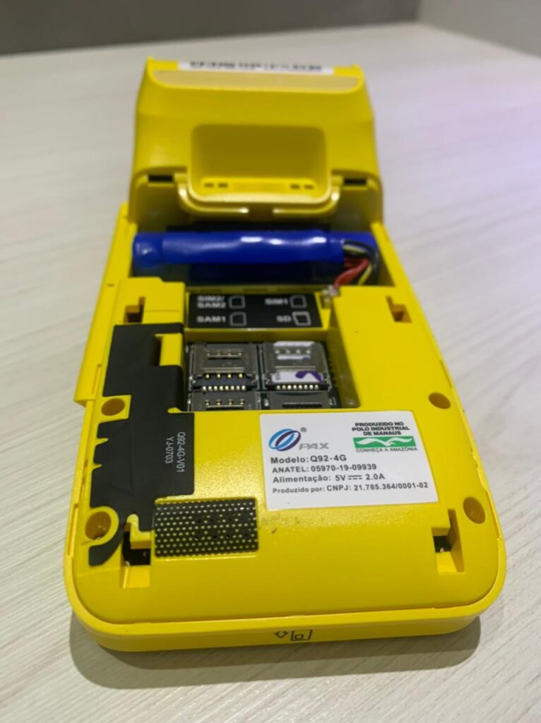Nesse modelo é ainda mais simples, dispensando o uso de parafusos. Para remover a tampa traseira vire a maquininha com a tela para baixo e utilizando as duas mãos faça pressão empurrando no sentido da seta. Tome cuidado para não aplicar muita força e danificar o display.