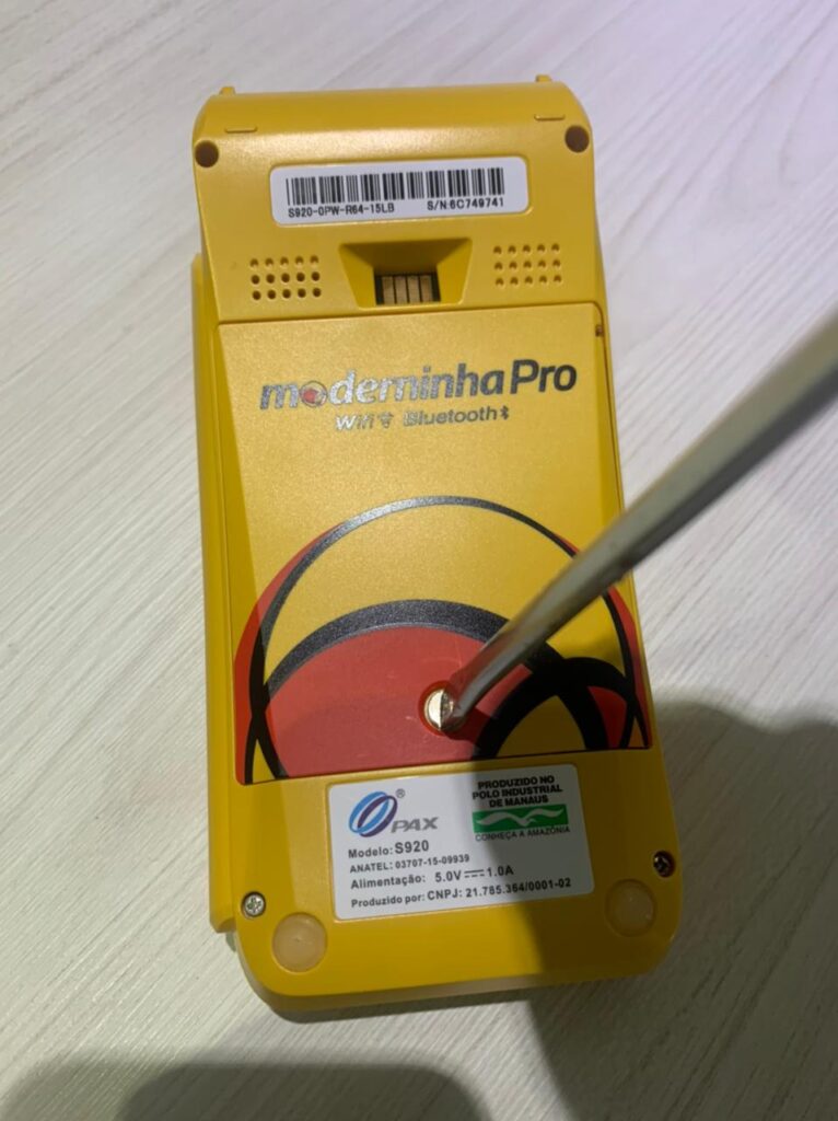 O procedimento é bastante semelhante em ambas, porém há alguns diferenciais entre cada aparelho. Na Moderninha Pro 1, por exemplo, é necessário utilizar uma chave de fenda para que seja possível remover o parafuso traseiro.