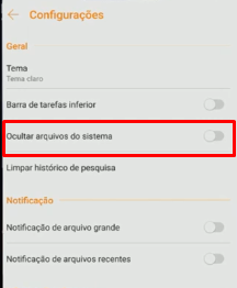 Passo 2: Entre no seu gerenciador de arquivos, toque sobre o menu 3 pontinhos, e desmarque a opção Ocultar arquivos do sistema para dar continuidade ao processo: