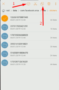 Agora você verá todas as pastas de stickers criados pelo Messenger, então você terá que TOCAR E SEGURAR sobre uma pasta, e em seguida toque no botão de selecionar todas os arquivos e depois clique no botão de COPIAR: