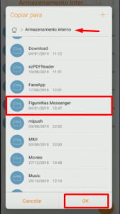 Passo 3: Agora selecione o Armazenamento Interno e logo em seguida CRIE uma pasta clicando no botão laranja e coloque o nome de Figurinhas Messenger e dê OK. Ainda em Armazenamento, faça o seguinte: