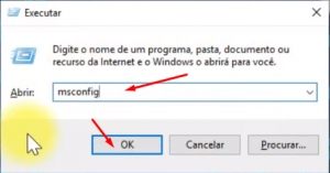 Passo 1: Pressione ao mesmo tempo, as teclas Windows + R e digite o seguinte comando na caixa “msconfig”: