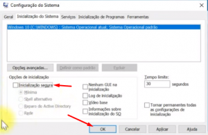 Passo 2: Agora, na aba Geral, selecione apenas a primeira bolinha de confirmação onde está escrito “Inicialização Normal”. Agora na aba Inicialização do sistema, DESMARQUE a opção inicialização de segurança: