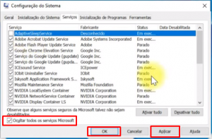 Passo 3: Na mesma janela aberta, você vai até a aba Serviços, e marque a caixinha no final para ocultar aplicativos da Microsoft. Feito isso, você verá os serviços que está iniciando junto com o PC, então, desmarque os serviços que você desconhece para que haja mais fluidez na máquina: