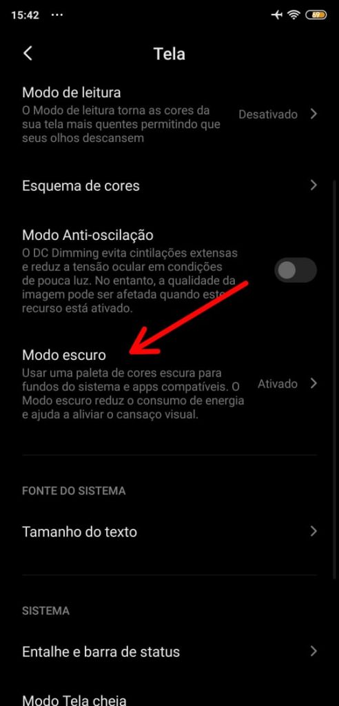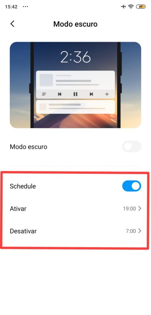 Ao ativar essa função o modo escuro será ativado e desativado no horário previamente programado.