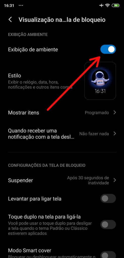 Esse modo está disponível apenas para telas AMOLED pois o consumo de bateria não é tão alto. Para ativar vá em: configurações > Visualização na tela e Tela de Bloqueio > Exibição de ambiente