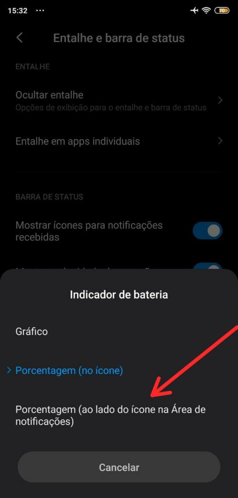 Na MIUI 10 era possível inserir a porcentagem da bateria apenas dentro do ícone, porém isso mudou na versão 11 do sistema e agora é possível colocar ao lado do ícone de bateria. Para isso vá em Configurações > Tela > Entalhe e barra de status > Indicador de bateria > Selecione uma opção.