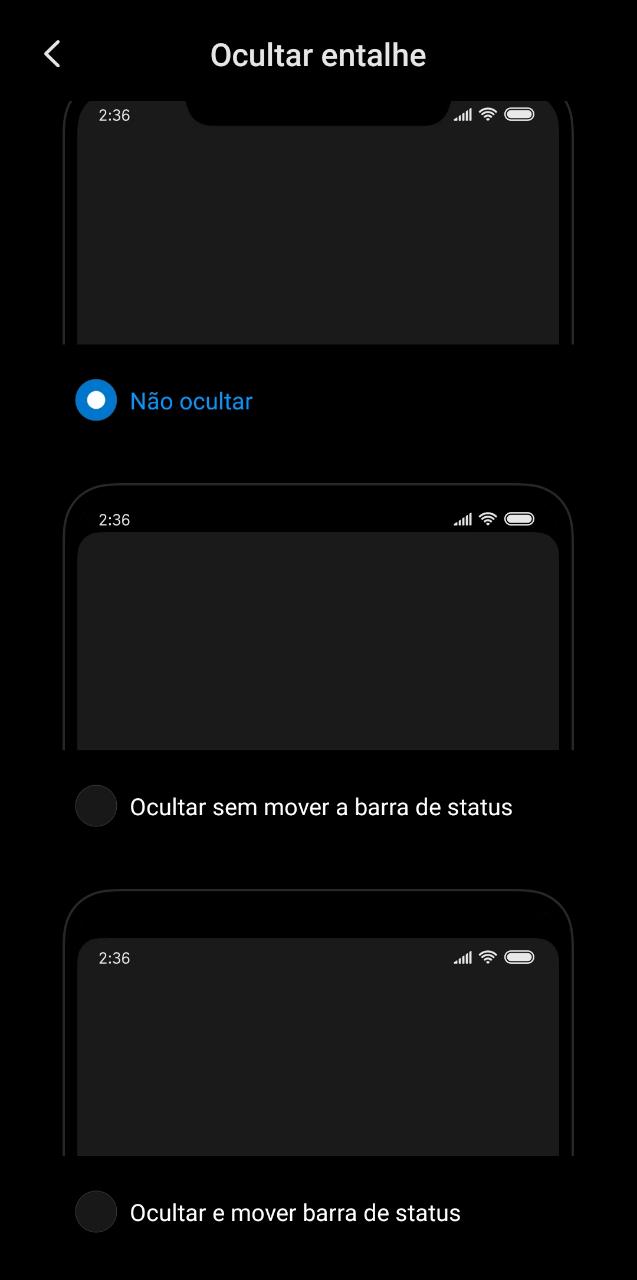 Para os aparelhos que possuem o entalhe – seja em gota ou retângulo – é possível ocultá-lo por meio de uma configuração do sistema. Para isso vá em: Configurações > Tela > Entalhe e barra de status > Ocultar entalhe > Selecione uma opção.