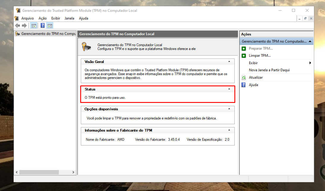Nesta tela verifique qual o status do TPM 2.0, se aparecer “O TPM está pronto para uso” significa que a sua máquina dispõe desse recurso e pode ser compatível com o Windows 11, caso atenda aos demais requisitos técicos.