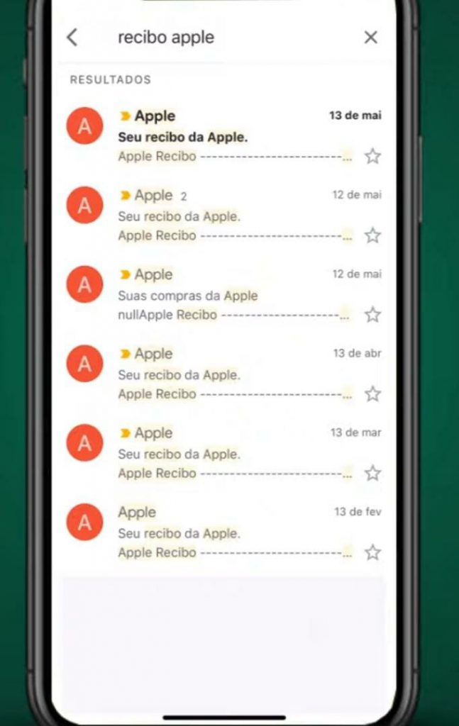 Abra o seu e-mail e procure por ‘Recibo Apple’ e em seguida localize o e-mail correspondente a compra que deseja reembolsar. Veja: