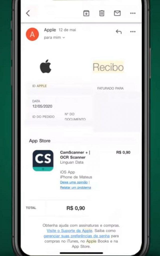 Em todos os pedidos feitos na AppleStore é enviado um recibo para o e-mail cadastrado contendo diversas informações, tais como: valor pago, forma de pagamento, nome do aplicativo e a opção para solicitar o estorno do valor pago.