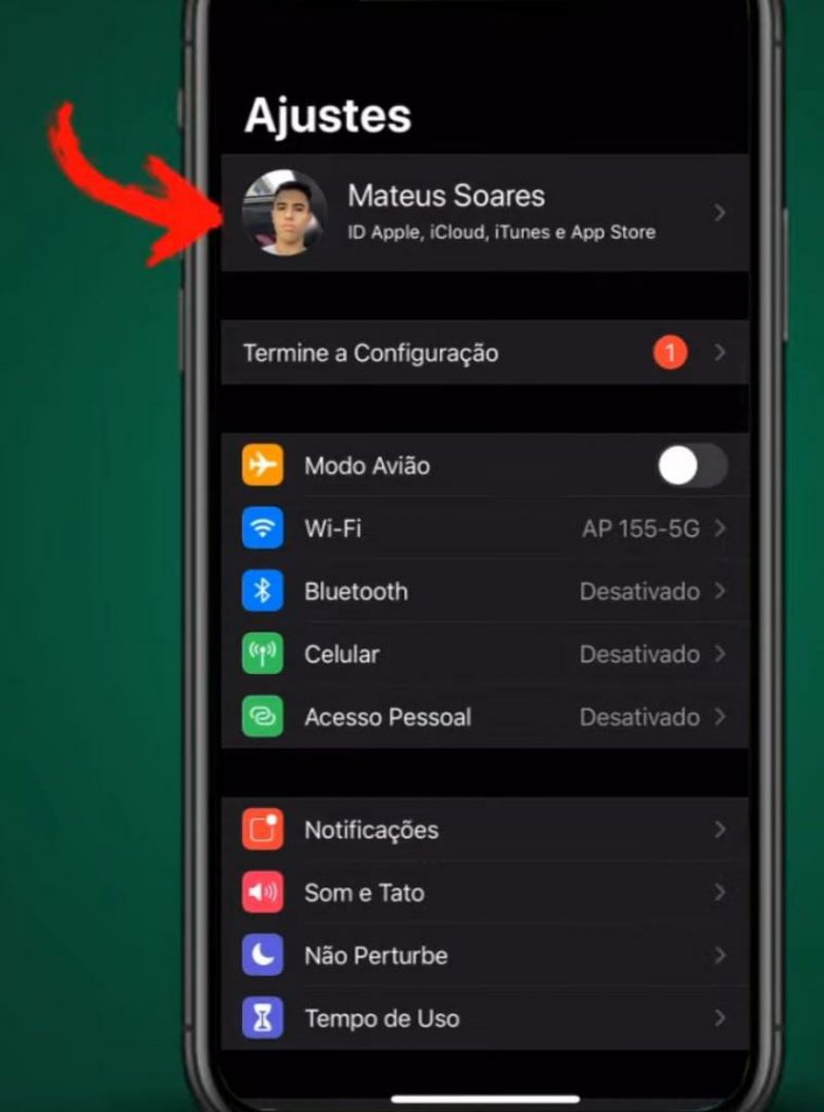 Primeiramente você deverá abrir às configurações do aparelho e em seguida tocar sobre seu perfil.